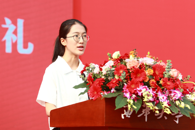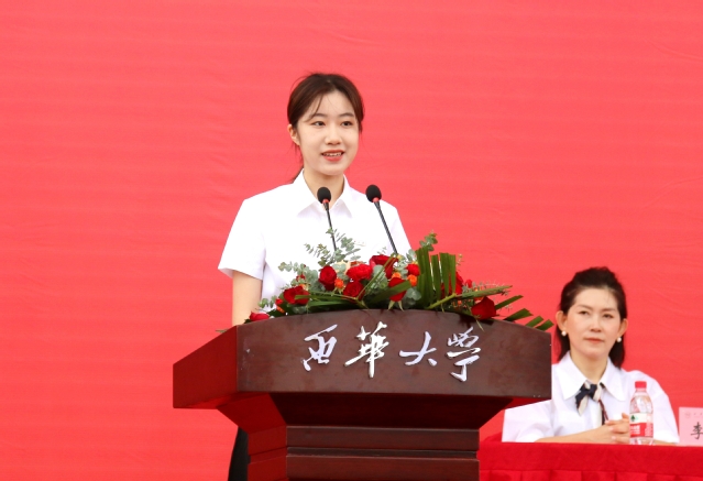 研究生新生代表、来自郫都校区的电气与电子信息学院黄鹏同学分享了自己西华本科四年的感想。“我们在最好的年纪来到西华,而西华同样也赐予了我们无限的机会。亲爱的同学们,请告别昨天,它是一张底片,多少遗憾终成回忆;请把握今天,它是一个起点,助我们踏上寻梦的征程。”他号召同学们牢记嘱托,为民族之复兴而读书;笃行实干,为母校之辉煌而读书;坚守底线,为人生之幸福而读书。