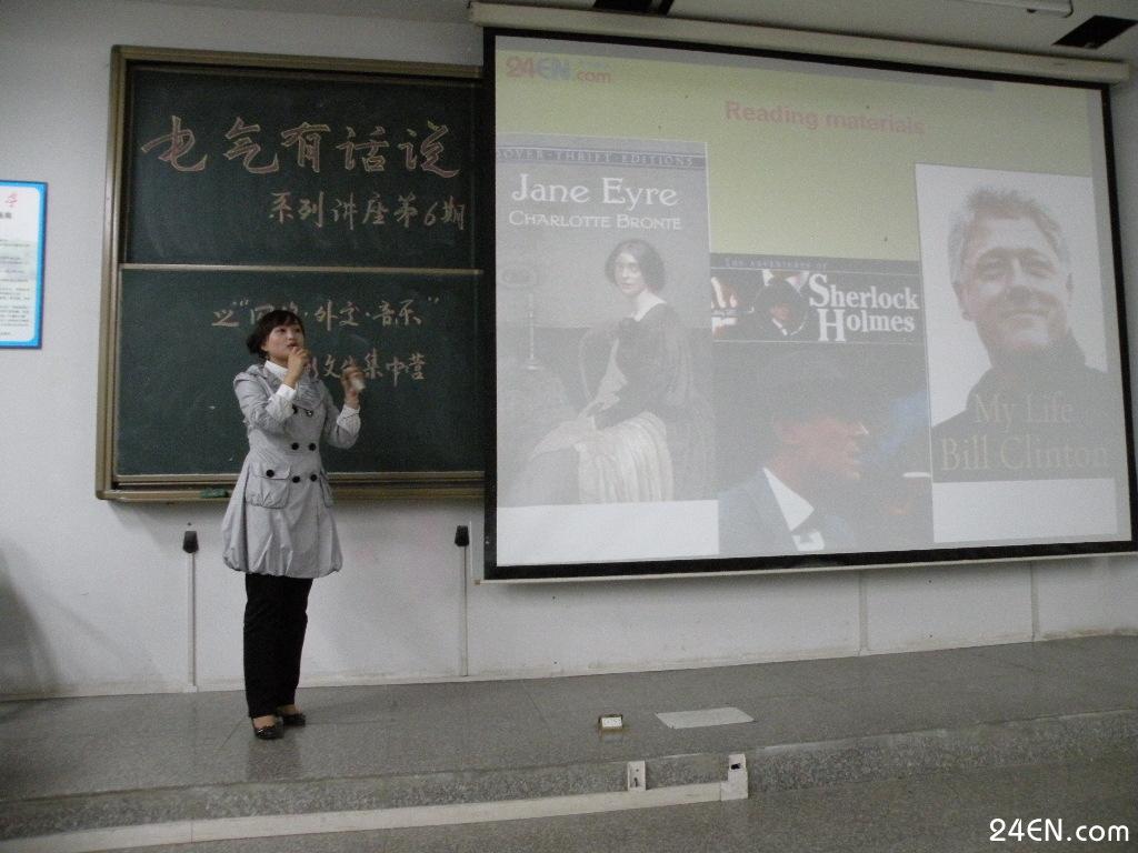 3月16晚19:00,“电气有话说”系列讲座第6期之网络、外交、音乐讲座在5C204举行,本次讲座由电气信息学院分团委学生会主办。 此次讲座由爱思英语网Ace Radio的主播Eddie、爱思英语网高级编辑Molly和爱思英语创办人周玉亮三位老师主讲。讲座由Eddie老师怀抱吉他弹唱英文歌曲开场,Molly老师则介绍了最“in”的英语学习法,周玉亮老师从电影、文学、音乐、运动等方面阐述了学习英语的方法。
