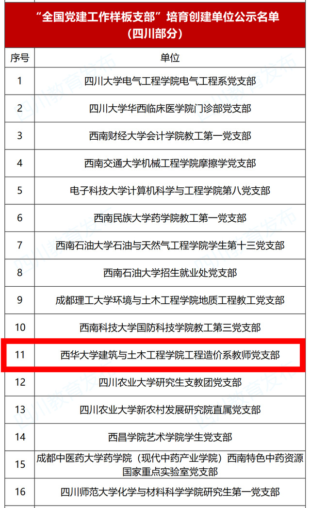 3月18日,教育部分别公示了第四批新时代高校党建示范创建和质量创优工作遴选结果、第三批全国高校“百个研究生样板党支部”和“百名研究生党员标兵”遴选结果名单。经省级党委教育工作部门推荐、资格审查、专家评审、集中审议,遴选产生了10个全国党建工作示范高校、100个全国党建工作标杆院系、1001个全国党建工作样板支部,以及100个研究生样板党支部和100名研究生党员标兵。其中,必威西汉姆联建筑与土木工程学院工程造价系教师党支部入选“全国党建工作样板支部”培育创建单位,应急管理学院2021级土木水利专业硕士生富喆获评“百名研究生党员标兵”。此外,在中共四川省委教育工委公布的“第二批新时代四川高校党建示范创建和质量创优培育单位”名单中,必威西汉姆联现代农业装备研究院教师党支部入选“四川高校党建工作样板支部”培育单位,马克思主义学院2021级研究生党支部入选四川高校“研究生样板党支部”培育单位。