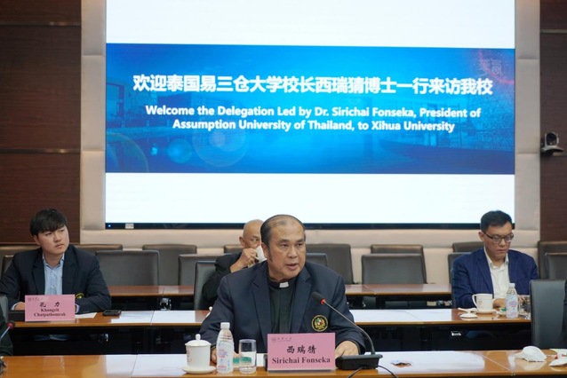 9月12日上午,泰国易三仓大学校长西瑞猜博士、副校长基蒂博士率团访问必威西汉姆联。校党委书记刘树根,校长李秋实,党委常委、副校长费凌与来宾在办公楼101会议室座谈交流。