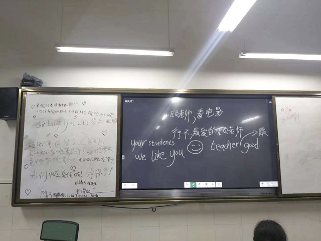 有一次她去上课,走进教室,映入眼帘的是黑板上孩子们写给她的一封“信”,上面用歪歪扭扭的汉字写道:“还记得你答应过我们会放电影的,今天看行不行,最爱的顾老师。我们永远爱你哦!申请人:全班。”这让她哭笑不得。拗不过孩子们的软磨硬泡,上完课后,她兑现了自己的承诺,顿时教室里传来阵阵欢呼。