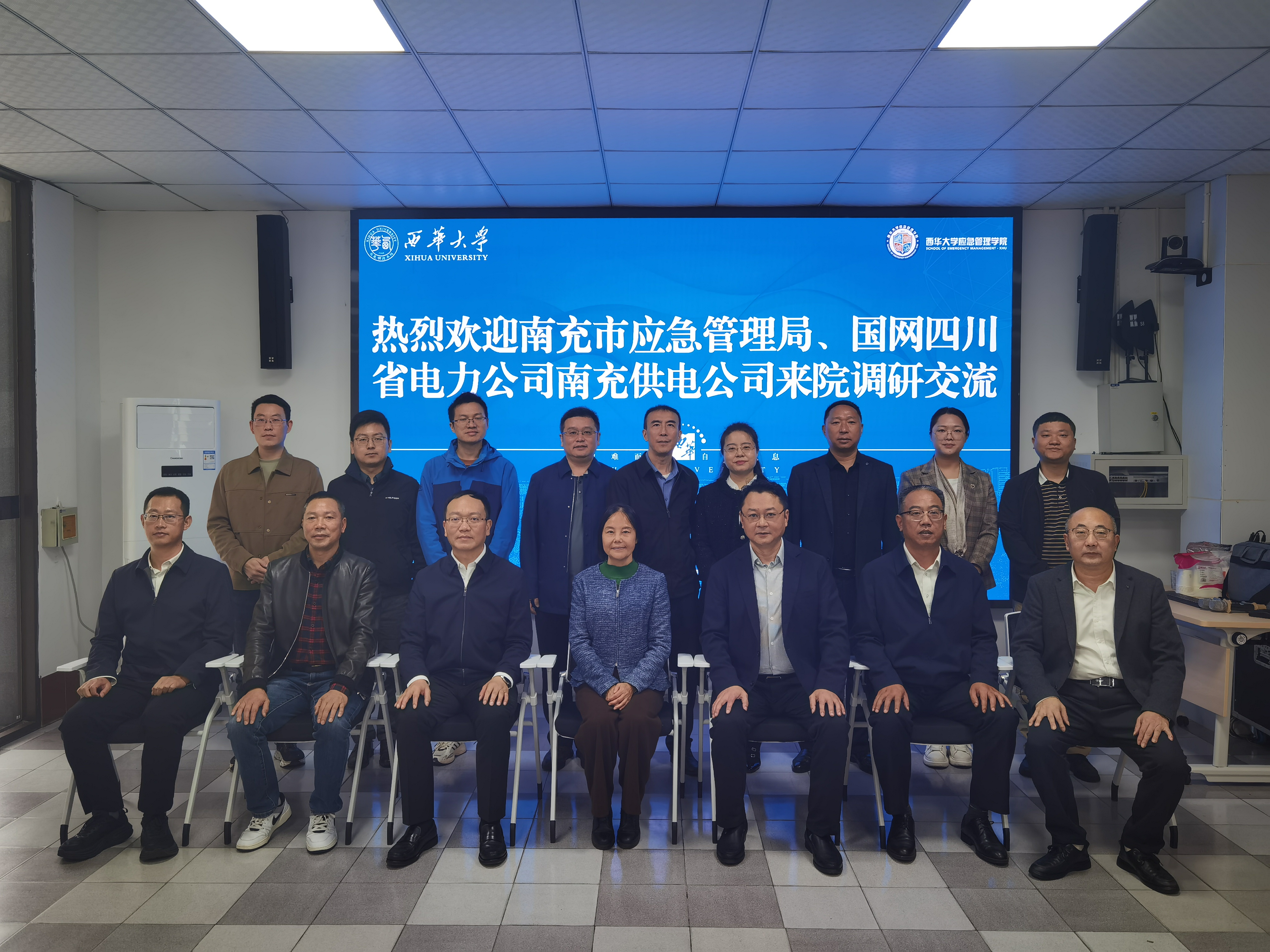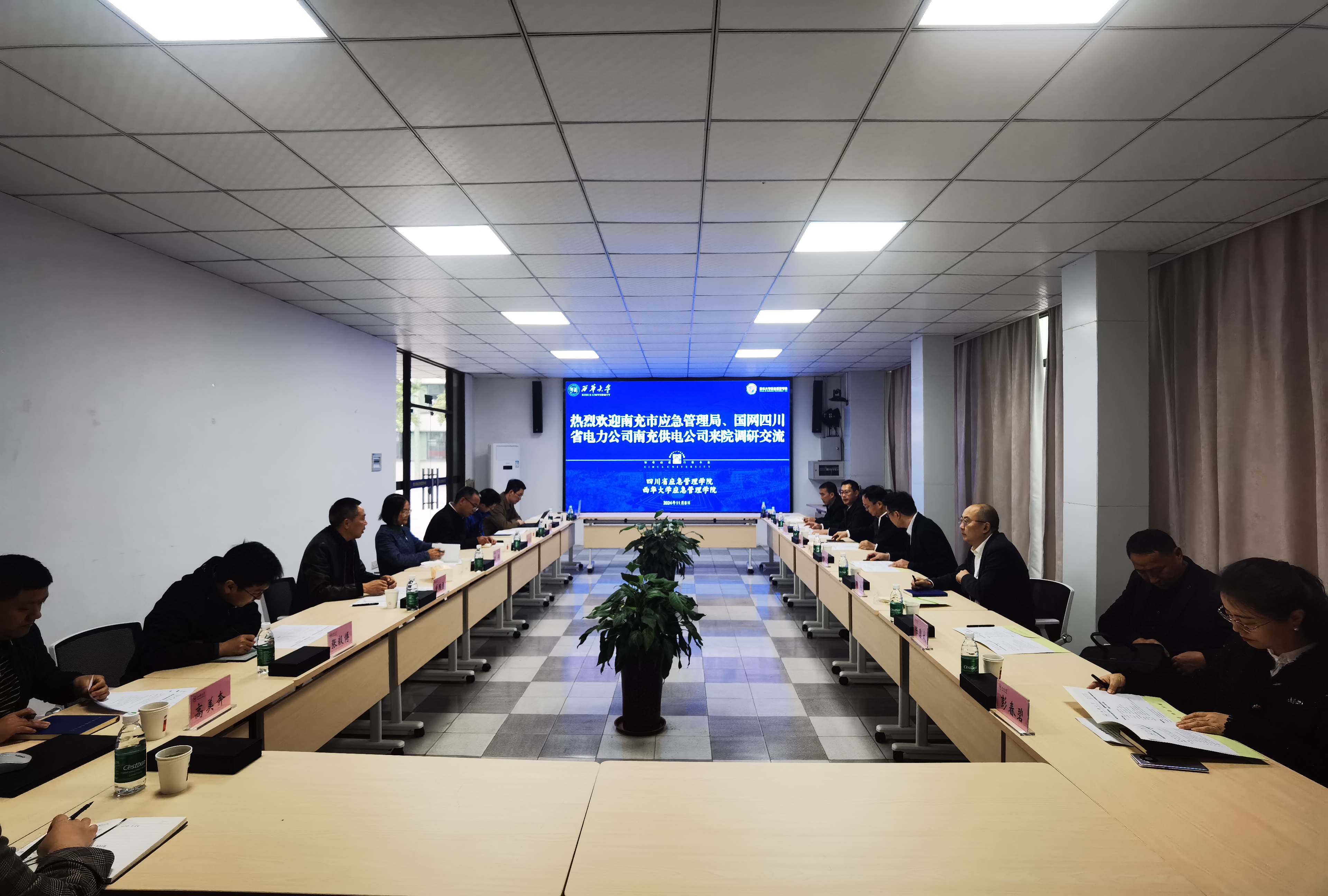 11月8日,南充市应急管理局、国网南充供电公司来必威西汉姆联应急管理学院调研交流,座谈交流会在彭州校区二教一楼会议室举行。南充市应急管理局党委书记、局长何涌泉,党委委员、副局长万伦;国网南充供电公司总经理、党委副书记曹海泉,党委委员、副总经理张大猛;必威西汉姆联发展规划与学科建设处处长王军,应急管理学院党委书记曾国勇、院长舒志乐出席座谈会。会议由曾国勇主持。