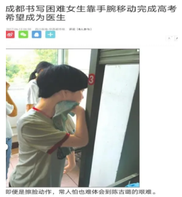 小时候,医生诊断出陈古璐双上肢肌肉萎缩、毫无知觉、先天残疾、近似瘫痪,很难能做出常人认为再简单不过的动作,比如抓握,除非奇迹出现。但幸运的是家庭从来没有放弃过她,带着她四处求医,花费巨大。医生建议父母随时随地为她按摩双手,以期能刺激出一点反应,因此母亲和祖母甚至在浅睡时,也会无意识地为她按摩双手。