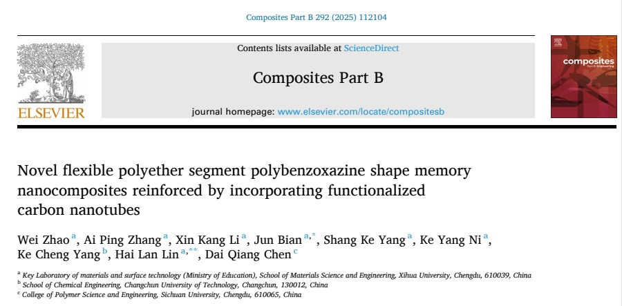近日,材料科学与工程学院卞军教授团队在复合材料领域国际顶刊Composites Part B(一区TOP,IF=12.7)发表高水平研究论文。论文题目为“Novel flexible polyether segment polybenzoxazine shape memorynanocomposites reinforced by incorporating functionalized carbon nanotubes”。卞军教授为论文的通讯作者,2022级硕士研究生赵威为第一作者。该研究工作得到了教育部春晖计划等项目的资助。