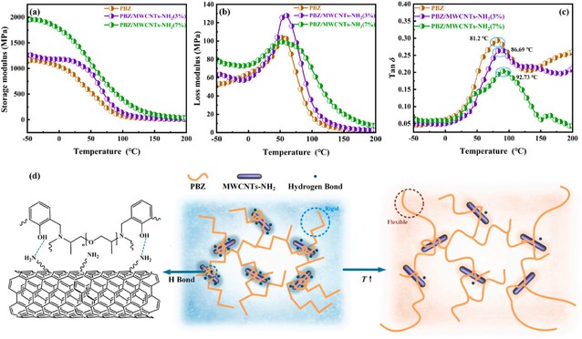 基于团队前期对PBZ及其纳米复合材料在结构材料方面的研究成果(Polym Compos. 2023;1-15. doi:10.1002/pc.27595; J. Appl. Polym. Sci. 2023, e53829; https://doi.org/10.1002/app.53829; Polym Compos. 2024;1-17. doi:10.1002/pc.28933),为了进一步探索PBZ纳米复合材料在功能及智能材料领域的应用,本研究首先通过分子设计并成功合成了新型的含柔性聚醚链段的苯并噁嗪预聚体,然后通过引入功能化多壁碳纳米管制备了PBZ形状记忆纳米复合材料。结果表明,多壁碳纳米管的表面基团与聚合物基体之间通过氢键和链段等超分子相互作用显著增强了PBZ的力学性能、耐热性能和形状记忆等性能,这为PBZ纳米复合材料在功能及智能材料领域的应用提供了有价值的借鉴。