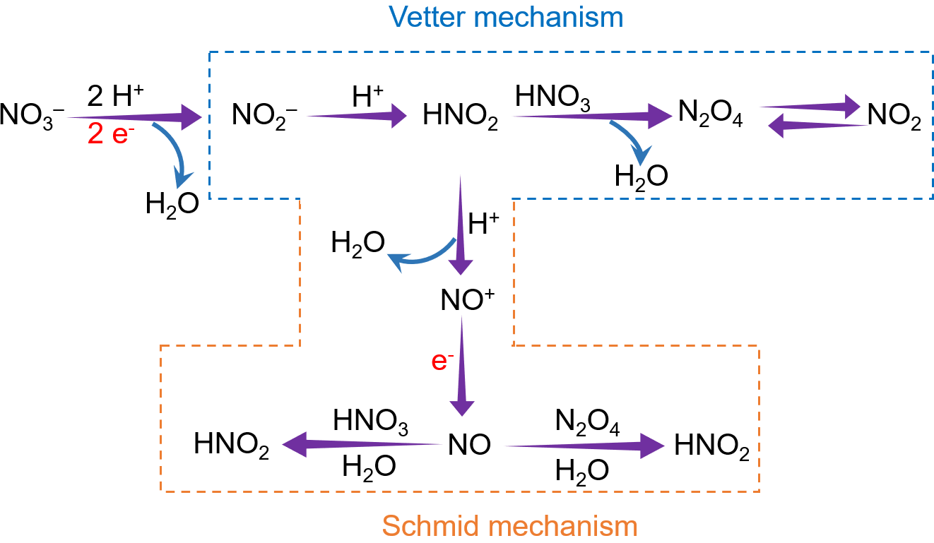 在强酸性环境下,当NO3−浓度在1.0 ~ 4.0 M范围内时,还原过程通常通过两种间接自催化还原途径进行:Vetter机制和Schmid机制。