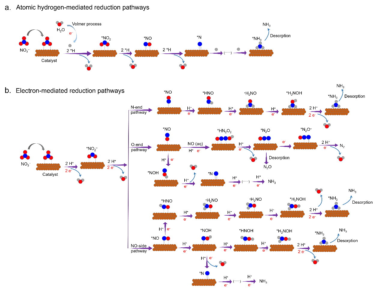 当NO3−的浓度小于1 M时,还原过程通常通过两种直接电催化途径进行:(a) 原子氢介导的还原途径和(b)电子介导的还原途径。
