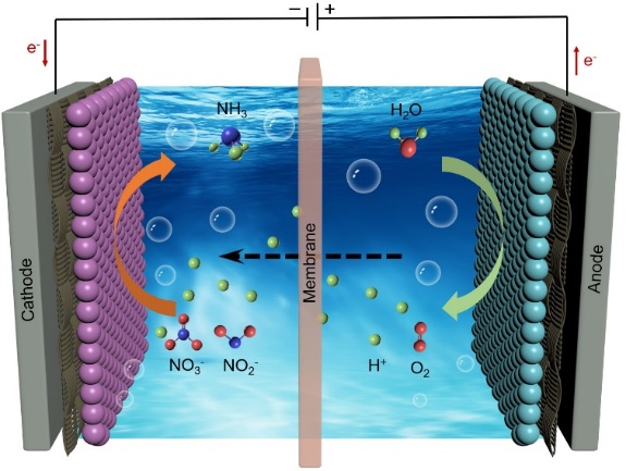 电催化氮氧阴离子(NOx−, 如NO3−和NO2−)还原合成氨的反应示意图。