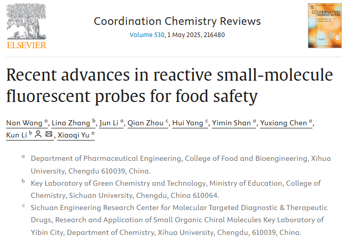 近日,食品与生物工程学院青年教师王楠博士在国际权威综述期刊 Coordination Chemistry Reviews(中科院一区,IF = 20.3)发表题为“Recent advances in reactive small-molecule fluorescent probes for food safety” 的综述论文。王楠博士为该论文的第一作者,bw必威西汉姆联官方网站为第一通讯单位,四川大学李坤教授为该论文的通讯作者。