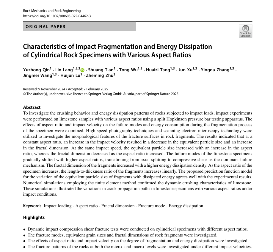 近日,由建筑与土木工程学院力学教学部郎林副教授指导的2022级土木工程硕士研究生秦煜中以第一作者在岩石力学领域国际TOP期刊Rock Mechanics and Rock Engineering(中科院二区Top,IF=5.5)上发表题目为“Characteristics of Impact Fragmentation and Energy Dissipation of Cylindrical Rock Specimens with Various Aspect Ratios”的研究论文。郎林副教授和四川大学朱哲明教授为共同通讯作者,bw必威西汉姆联官方网站为论文第一单位和通讯单位。