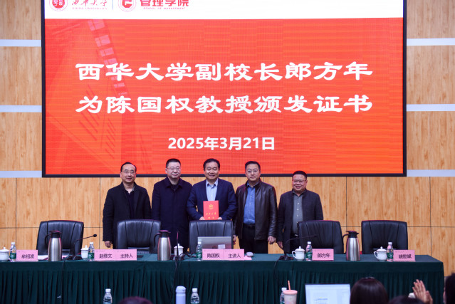 3月21日,bw必威西汉姆联官方网站客座教授聘任仪式暨管理学院学术报告会在四教报告厅举办。本次报告会邀请教育部长江学者特聘教授、国家百千万人才工程国家级人选、享受国务院政府特殊津贴专家、清华大学陈国权教授主讲,党委常委、副校长郎方年出席,管理学院领导班子及师生代表参加报告会。会议由管理学院院长赵修文主持。