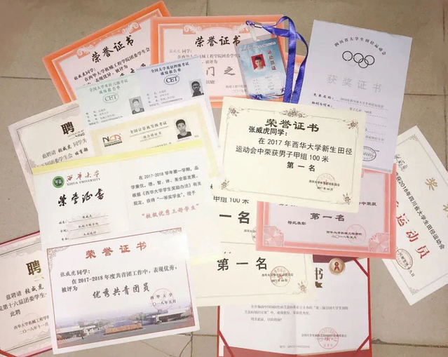 “张威虎是老师们眼中全面发展的优秀学子。学习上,刻苦努力,成绩一直名列专业前茅,还酷爱体育运动,曾多次在学校的体育竞赛中荣获冠军,同学们称他为风一样的男子。”辅导员朱利这样评价张威虎。“大一时,我作为体育部的干事负责新生运动会运动员的训练事宜,突发奇想也试着跑了跑一百米,没想到和运动员的成绩差不多。”张威虎说。那一次,从来没参加过运动会的他在新生运动会上拿到了第一名。在之后的校运动会也勇夺冠军,其后被选拔至四川省大学生田径运动会参加男子100m乙组(非专业队)比赛。