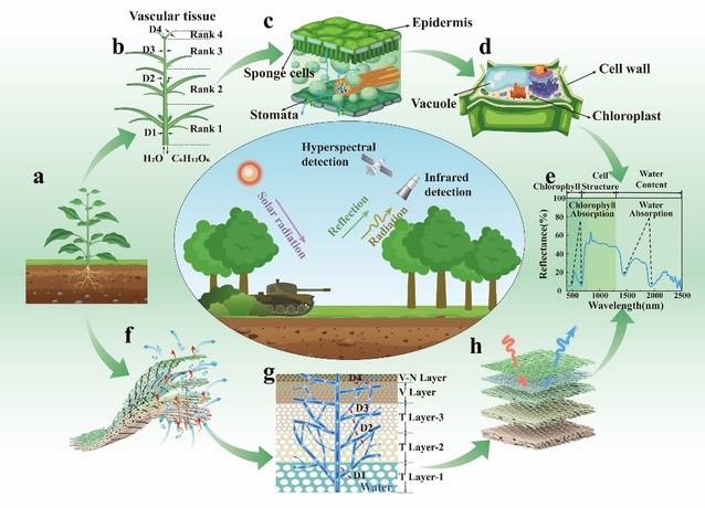 在仿生学的启发下,袁乐教授团队采用静电纺丝技术构建了类天然叶片的多级分层网络结构,实现了可见光、热红外及高光谱波段的全天候、宽频、智能伪装。该静电纺丝织物具备在水分驱动下的黄-绿可逆变色能力,可自适应模拟天然树叶在不同生长阶段的色彩变化;通过多层纤维间的光谱耦合效应,该材料的反射光谱曲线与绿色树叶高度相似,使其具备卓越的高光谱伪装性能,可使多种经典的高光谱分类算法误将其识别为天然树叶;此外,精心设计的梯度孔隙多层结构具有优异的单向导水性能,有效模拟了植物的蒸腾散热效应,蒸腾速率是传统绿色伪装织物的四倍,即使在炎热的夏季,其红外辐射温度与天然叶片的最大差异也仅为1.01℃。本研究为开发宽谱、高性能的智能伪装材料提供了一种新颖策略,该策略在伪装遮障器材、单兵伪装服饰,以及个人热调节材料领域具有广阔的应用前景。