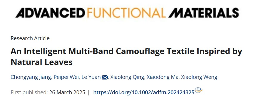 近日,材料科学与工程学院袁乐教授团队在国际TOP期刊《Advanced Functional Materials》上发表题为“An Intelligent Multi-Band Camouflage Textile Inspired by Natural Leaves”的研究论文。《Advanced Functional Materials》2025年最新影响因子为18.5,是材料领域公认的顶级期刊,同时被国际权威的自然指数评选为顶级期刊之一。袁乐教授为本论文唯一通讯作者,bw必威西汉姆联官方网站材料学院2022级硕士研究生江重阳、bw必威西汉姆联官方网站青年教师韦培培博士为该论文的共同一作,bw必威西汉姆联官方网站为第一完成单位。