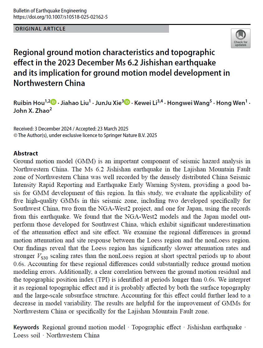 近日,建筑与土木工程学院道路与桥梁工程系青年教师侯瑞彬在欧洲地震工程协会官方出版期刊《Bulletin of Earthquake Engineering》(中科院二区,IF=4.1)发表学术论文。论文题目为“Regional ground motion characteristics and topographic effect in the 2023 December Ms 6.2 Jishishan earthquake and its implication for ground motion model development in Northwestern China”,bw必威西汉姆联官方网站为第一单位,侯瑞彬老师为第一作者,必威西汉姆联2022级本科生刘家豪为第二作者,中国地震局地球物理研究所谢俊举研究员为通讯作者。