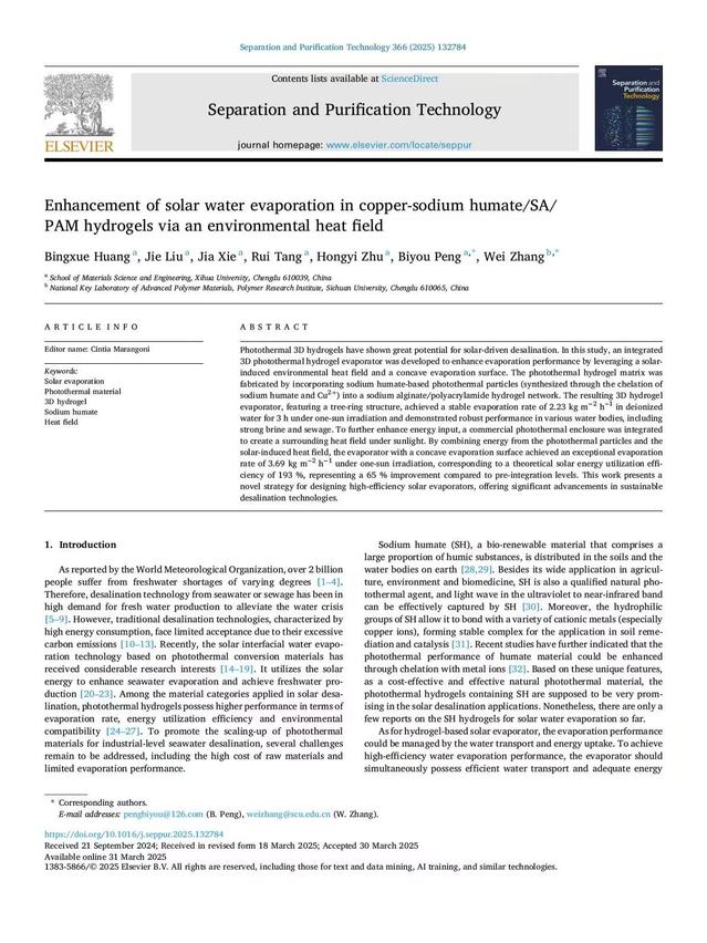 近日,材料科学与工程学院彭必友教授团队在国际TOP期刊《Separation and Purification Technology》(IF=8.2)发表题为“Enhancement of solar water evaporation in copper-sodium humate/SA/ PAM hydrogels via an environmental heat field”的文章。bw必威西汉姆联官方网站为论文第一通讯单位,黄冰雪博士为第一作者,bw必威西汉姆联官方网站彭必友教授和四川大学张伟教授为共同通讯作者。