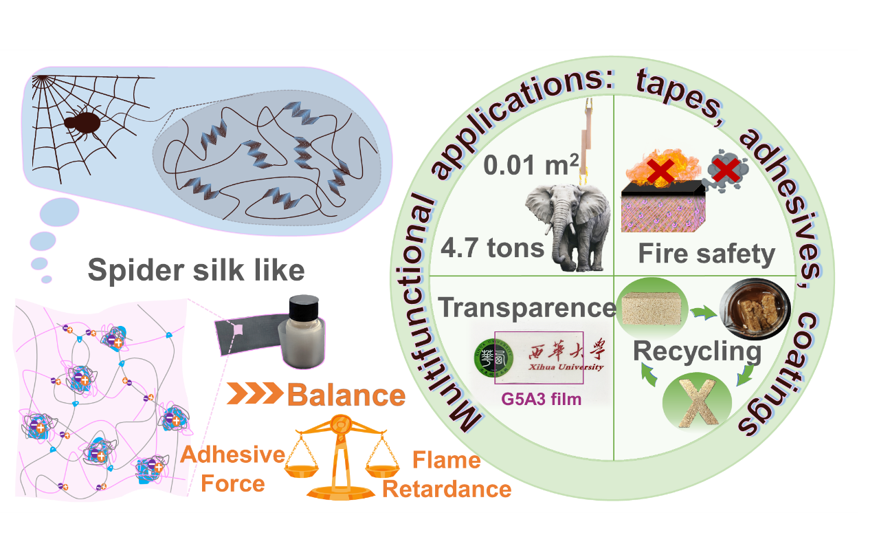 针对这一难题,课题组受蜘蛛丝异质结构的启发,构建了一种可逆的离子键/氢键诱导的异质结构,以增强内聚力,实现粘接性与阻燃性的协同,制备出了具有高粘接强度和优异阻燃性能的可循环生物基胶粘剂。所得的胶粘剂在木材上的粘接强度达到4.7 MPa,即使在室温浸水、高湿和高温的恶劣条件下,其粘接强度仍保持3.1~4.3 MPa。该胶粘剂还具有优异的透明性和成膜性,还可作为涂料使用。制备的涂覆聚氨酯泡沫、颗粒板、多层板复合材料的极限氧指数由18~28%至31~46%,热释放和烟释放降低40~49%和25~75%,表现出卓越的粘合强度和出色的消防安全性。此外,由于离子键/氢键可逆组装,该生物基胶粘剂及其复合材料在60°C热水下具有可逆回收性,回收后胶粘剂的搭接剪切强度保持98%以上,回收后复合材料的极限氧指数保持96%以上,表现出优异的可循环使用性。
