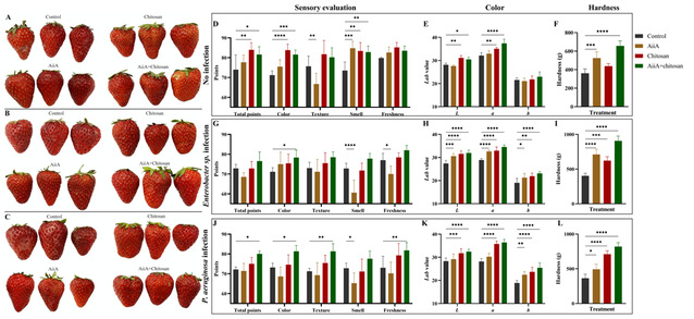 图5 AiiA和壳聚糖对肠杆菌或铜绿假单胞菌感染草莓保鲜的影响。未感染细菌(A)、肠杆菌(B)和铜绿假单胞菌(C)侵染的草莓外观;对未感染细菌(D)、肠杆菌(G)和铜绿假单胞菌(J)感染的草莓的感官评价(颜色、质地、气味、新鲜度和总分)。未感染细菌(E)、肠杆菌(H)和铜绿假单胞菌(K)感染的草莓颜色测定;未感染细菌(F)、肠杆菌(I)和铜绿假单胞菌(L)感染的草莓硬度。