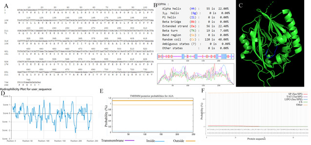 图1 蛋白AiiA的结构分析。(A) AiiA核苷酸和氨基酸序列;(B) AiiA二级结构;(C) AiiA三级结构;(D) AiiA亲水性;(E) AiiA跨膜蛋白分析;(F) AiiA信号肽。