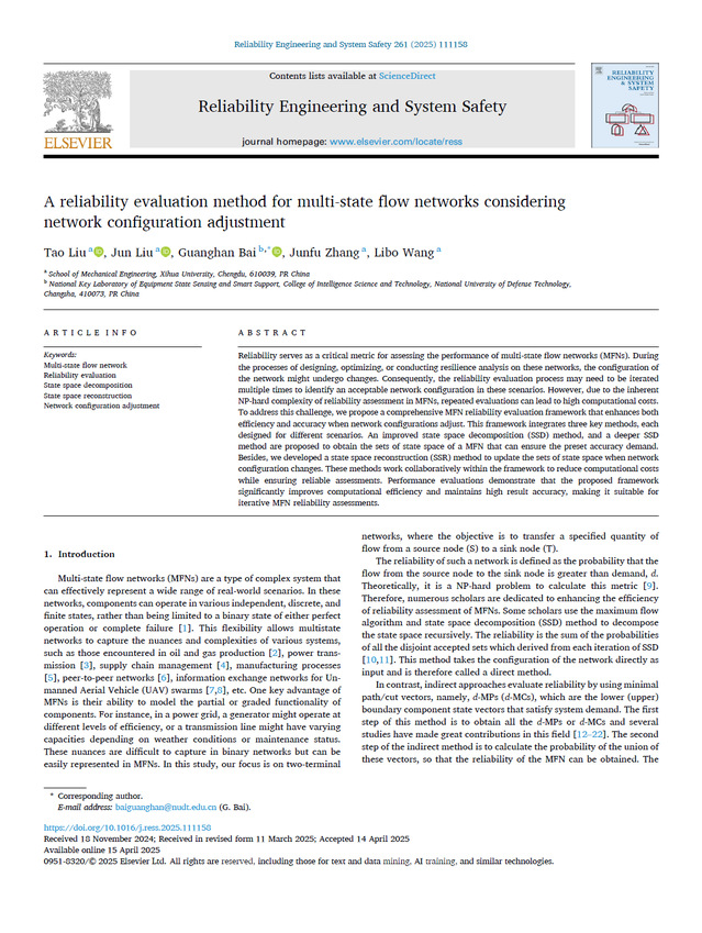 近日,机械工程学院张均富教授研究团队在《Reliability Engineering and System Safety》(中科院SCI一区,影响因子9.4) 发表题为“A reliability evaluation method for multi-state flow networks considering network configuration adjustment”的研究论文。团队刘涛老师为论文第一作者,2024级硕士研究生刘俊为论文的第二作者,国防科技大学白光晗副研究员为通讯作者,bw必威西汉姆联官方网站为论文第一完成单位。