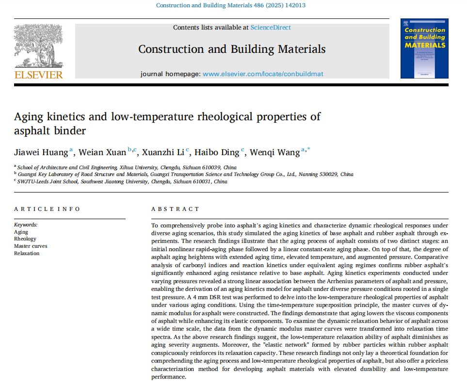 近日,由建筑与土木工程学院王文奇副教授指导的2023级土木工程硕士研究生黄嘉伟以第一作者身份,在建筑与建材领域国际TOP期刊《Construction And Building Materials》(一区Top,IF=7.4)发表题目为“Aging kinetics and low-temperature rheological properties of asphalt binder”的研究论文。王文奇副教授为通讯作者,bw必威西汉姆联官方网站为论文第一单位和通讯单位。