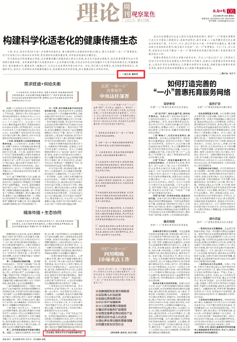 《成都日报》6月18日第6版的理论版,全文刊发我院胡大海老师与潘殊闲教授联合署名的文章《构建科学化适老化的健康传播生态》,全文如下: