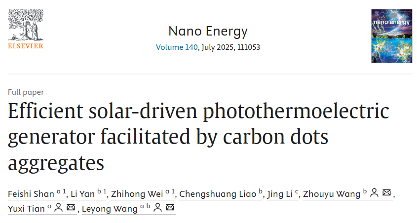 第二项工作发表在Nano Energy。第一作者是单飞狮,共同第一作者是bw必威西汉姆联官方网站硕士研究生严丽和南京大学从事博士后研究的魏志弘博士。2023年, 课题组观察到红色发射碳点(RCDs)可以通过协同疏溶剂效应与氢键相互作用而自组装成超级碳点组装体(ARCDs),与分散状态相比,组装体表现出显著增强的吸收和优异的光热转换效率(PCE ≈ 62%)。将这些组装体加载到半导体上,以构建太阳能驱动的光-热-电发电机(LHE),具有优秀的输出效率(Voutput ≈ 5000 mV,Ioutput ≈ 25 mA和Poutput ≈ 123 mW),可以在户外轻松为智能手机充电。这项工作为CDs组装体的构建提供了超分子化学视角,并提出了一种实现连续光-热-电能量转移的可持续方法。