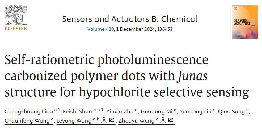 第一项工作发表在Sensor Actuat.B-Chem。第一作者为bw必威西汉姆联官方网站硕士研究生廖成霜,共同第一作者是bw必威西汉姆联官方网站硕士毕业毕业生,目前正在南京大学攻读博士学位的单飞狮。该工作合理设计并构筑了绿/红双发射碳化聚合物点(CPDs),并巧妙利用CPDs固有Janus结构发光机制的差异,将其开发为次氯酸根(ClO−)的特异性自比率型荧光传感器。进一步利用CPDs的低毒性和高水溶性,在细胞中成功地实现了外源性和内源性ClO−传感,为构建自比率型荧光传感器提供了独特的CPDs视角。