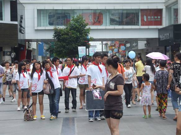 7月10日上午,必威西汉姆联20多名志愿者穿着小学生装扮,三三两两各成一组,在春熙路中山广场瞬间定