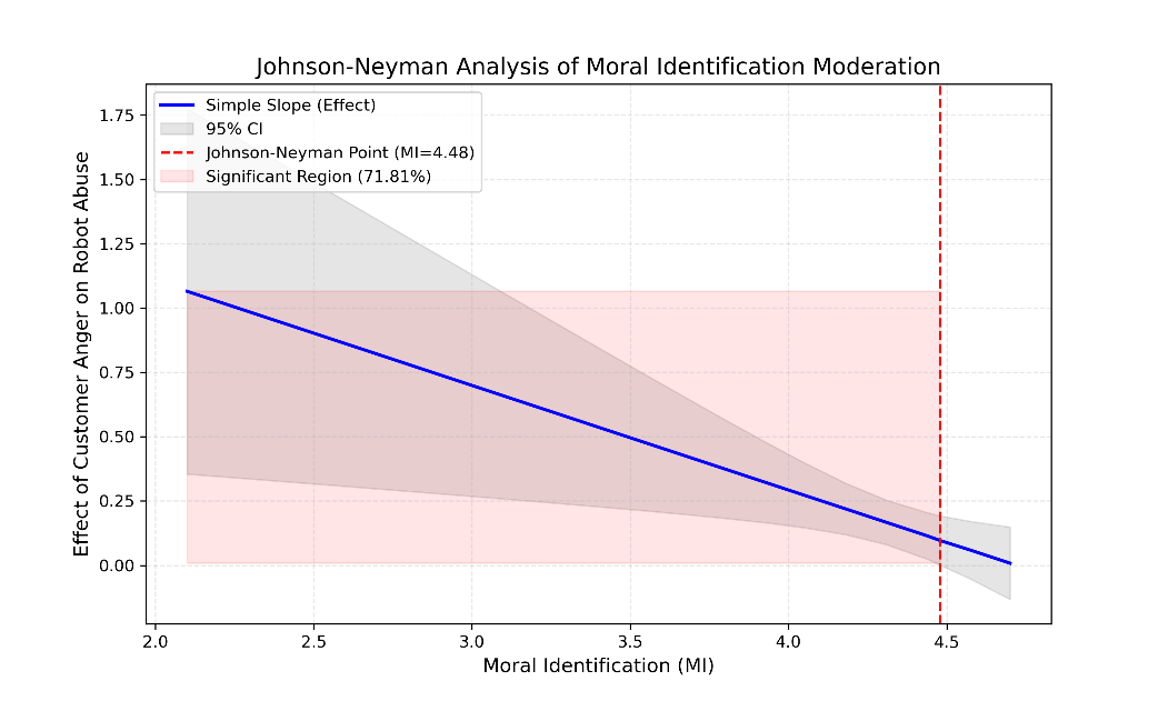 研究二基于227份有效样本,检验了道德认同在顾客愤怒与机器人虐待之间的调节作用。结果显示,道德认同显著负向调节二者之间的关系(b = −1.18,p < 0.05),即道德认同越高,顾客愤怒对机器人虐待行为的正向影响越弱。进一步的 Johnson–Neyman 区间分析表明,当道德认同得分低于 4.48时,占样本 71.81% 的顾客在愤怒水平越高的情况下,越容易实施虐待机器人行为(bJN = 0.06, SE = 0.03, t = 1.97, p = 0.05);而在道德认同水平高于这一临界值时,这种关系不显著。这一结果表明,道德认同水平较高的顾客在面对负面情绪时,更能克制对机器人的攻击性行为。
