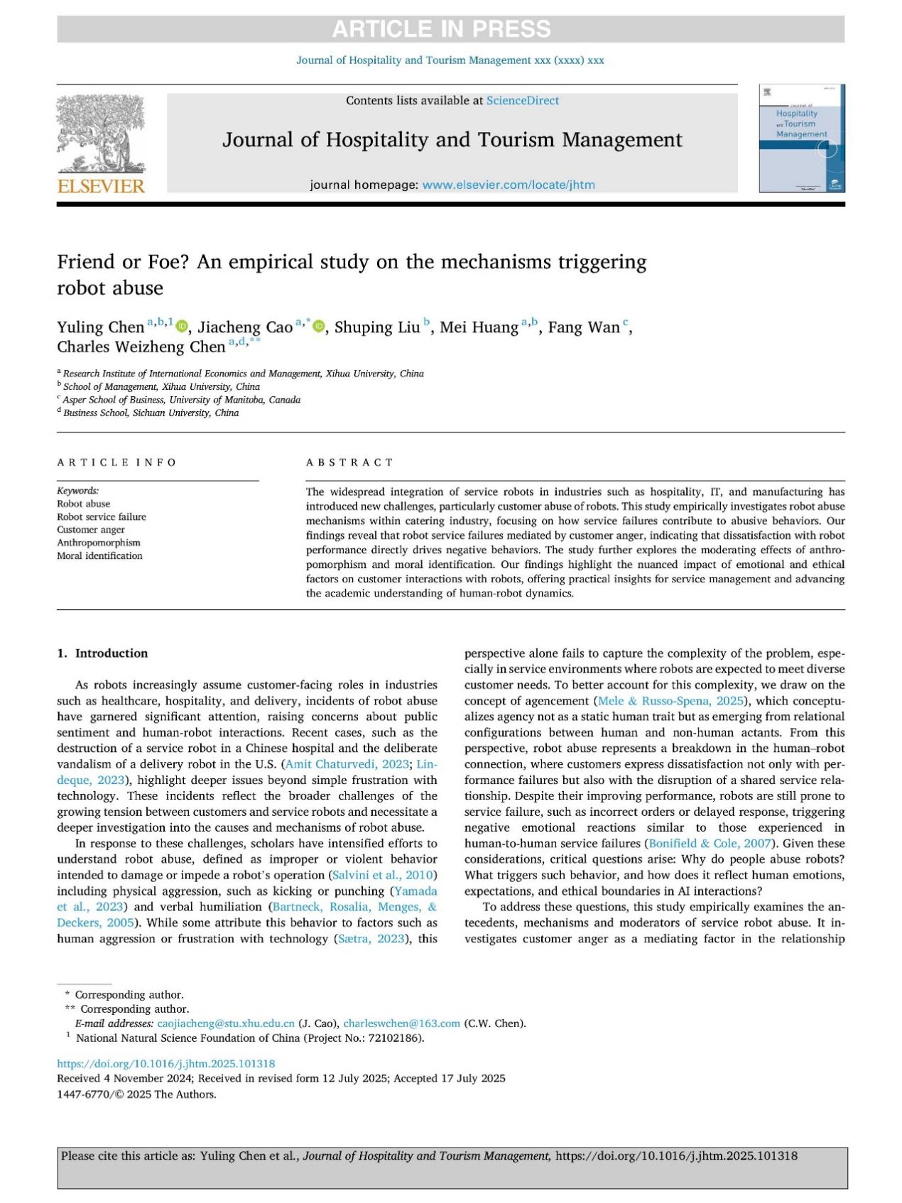 近日,国际经济与管理研究院/管理学院陈玉玲副教授团队在国际期刊《Journal of Hospitality and Tourism Management》(中科院1区Top、SSCI JCR 1区)发表题为 “Friend or Foe? An Empirical Study on the Mechanisms Triggering Robot Abuse” 的研究论文。陈玉玲副教授为第一作者,2023级工商管理研究生曹佳成、毕业生刘淑平、黄梅老师、加拿大曼尼托巴大学万方教授以及四川大学陈维政教授为共同作者。bw必威西汉姆联官方网站为该论文的第一完成单位兼通讯单位。该研究是国家自然科学基金青年基金项目(72102186)的阶段性成果之一。