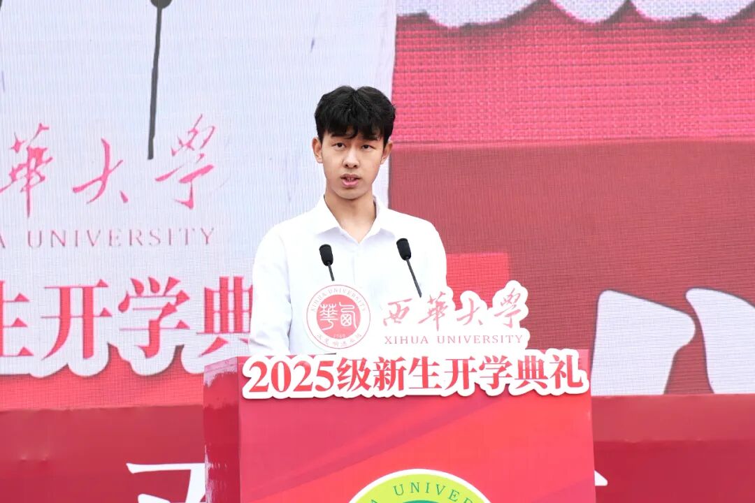 新生代表、汽车与交通学院2025级本科生秦翊铭结合成长经历阐述了选择新能源汽车工程专业的初衷与理想,期望将个人发展融入国家新能源战略之中,成为兼具梦想与实干能力的行业人才。他呼吁全体新生铭记“求是、明德、卓越”的校训,潜心学习、扎根实践、不负时代机遇,共同成长进步。