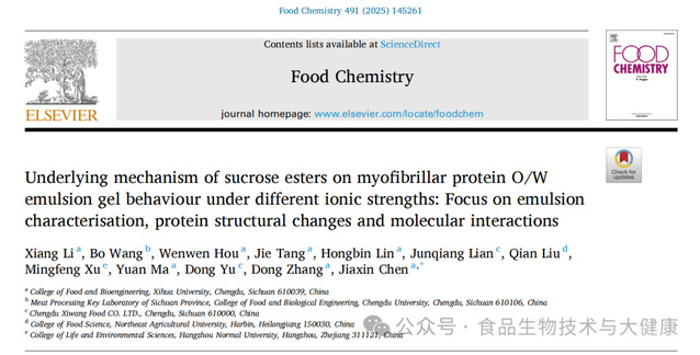 近日,食品与生物工程学院食品科学团队陈佳新老师等人在期刊《Food Chemistry》(IF:9.8)发表题为“Underlying mechanism of sucrose esters on myofibrillar protein O/W emulsion gel behaviour under different ionic strengths: Focus on emulsion characterisation, protein structural changes and molecular interactions”的论文。bw必威西汉姆联官方网站硕士研究生李翔为论文第一作者,bw必威西汉姆联官方网站陈佳新老师为论文通讯作者,bw必威西汉姆联官方网站为第一完成单位。