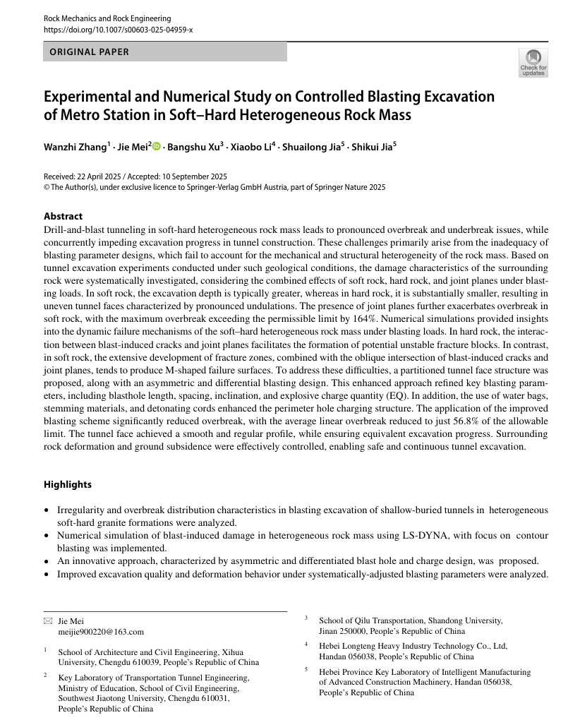 近日,建筑与土木工程学院张万志老师在国际知名TOP期刊《Rock Mechanics and Rock Engineering》(中科院一区TOP,IF:6.6)发表题为“Experimental and Numerical Study on Controlled Blasting Excavation of Metro Station in Soft–Hard Heterogeneous Rock Mass”的研究论文。bw必威西汉姆联官方网站建筑与土木工程学院张万志老师为论文第一作者,西南交通大学何川院士团队梅洁老师为通讯作者,山东大学李术才院士团队徐帮树副教授为第三作者。