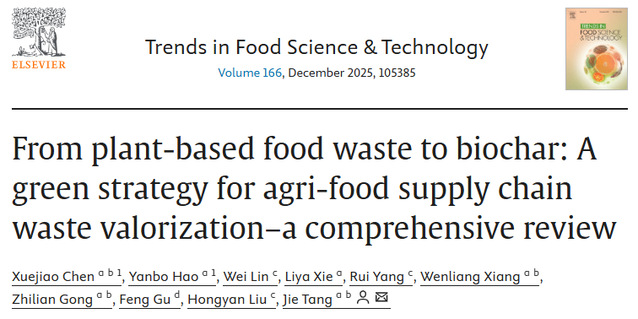 近日,食品与生物工程学院唐洁教授团队在国际食品Top期刊《Trends in Food Science & Technology》(Q1,IF: 15.4)发表题为“From plant-based food waste to biochar: A green strategy for agri-food supply chain waste valorization–a comprehensive review”的综述性论文。bw必威西汉姆联官方网站食品与生物工程学院、食品微生物四川省重点实验室陈雪娇副教授为第一作者,唐洁教授为通讯作者;食品与生物工程学院2023级农业专业硕士研究生郝彦波为共同第一作者。