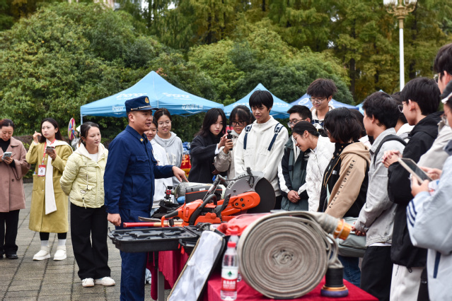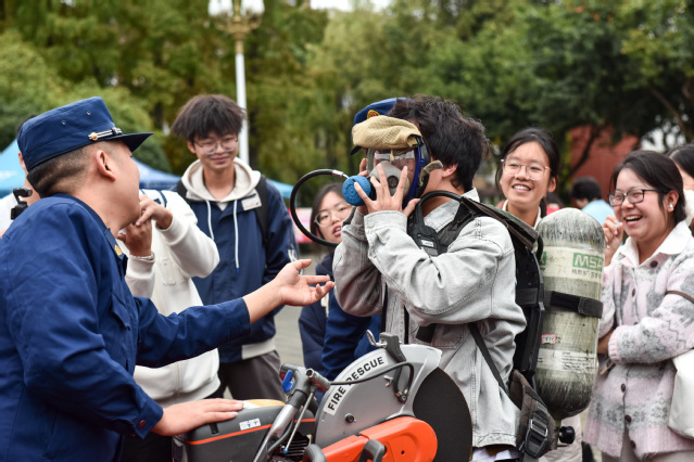 在互动体验环节,同学们积极参与,试戴正压式空气呼吸器、操作消防锯,直观学习正确穿戴防护装备的方法。消防员还详细介绍了消防车随车灭火设备,深入浅出地讲解多种火灾类型,帮助大家掌握正确报火警的流程与要点。结合高校生活实际,现场还列举了宿舍常见火灾隐患,进一步强化同学们的防范意识。汽车与交通学院学生叶昱泽表示,这次活动让他对消防工作有了全新的认识。“光是看同学试穿厚重的灭火防护服,听消防员讲解在火场里有多闷热,我就觉得非常震撼,”他说,“以前觉得火灾隐患提醒是老生常谈,但今天亲眼看到这些装备、听到真实案例,才直观地感受到危险可能就在身边,我们一定要重视。”