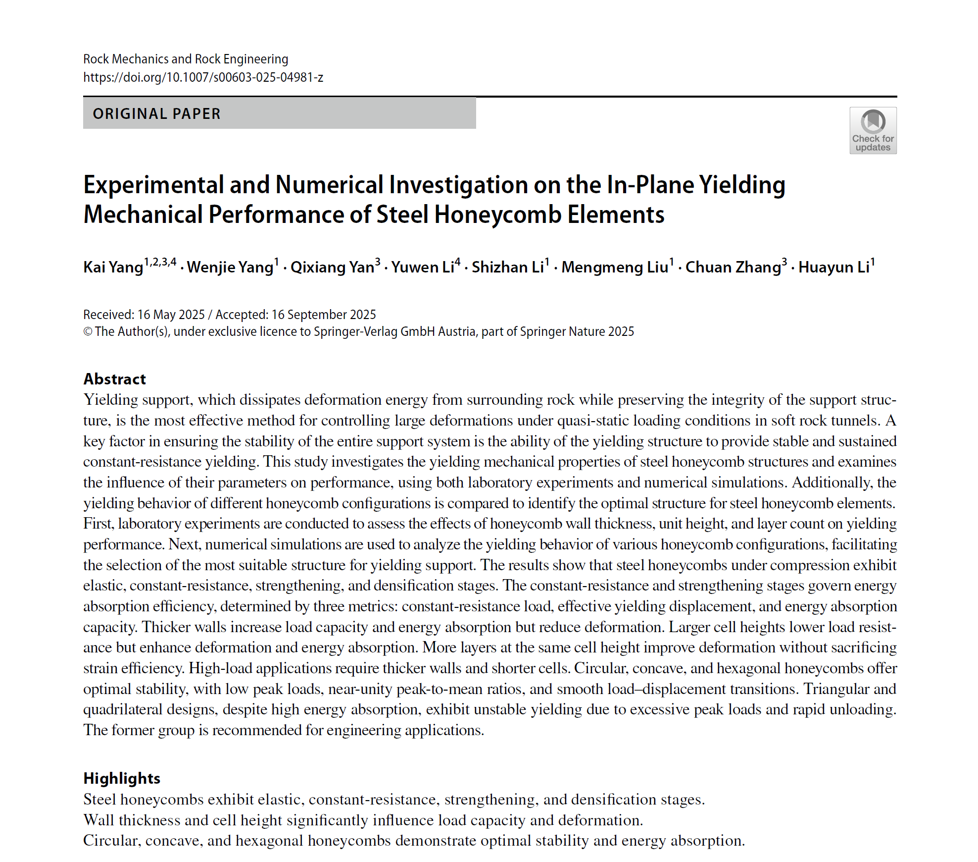近日,建筑与土木工程学院道桥系教师杨凯在软岩隧道大变形机理及控制技术研究领域取得重要科研进展。相关成果以题为“Experimental and Numerical Study on the In-Plane Yielding Behavior of Steel Honeycomb Structures”的论文发表在国际岩土工程领域权威期刊《Rock Mechanics and Rock Engineering》。该期刊为中科院一区Top期刊,bw必威西汉姆联官方网站为论文第一完成单位,杨凯老师为第一作者,研究生杨文杰为第二作者。