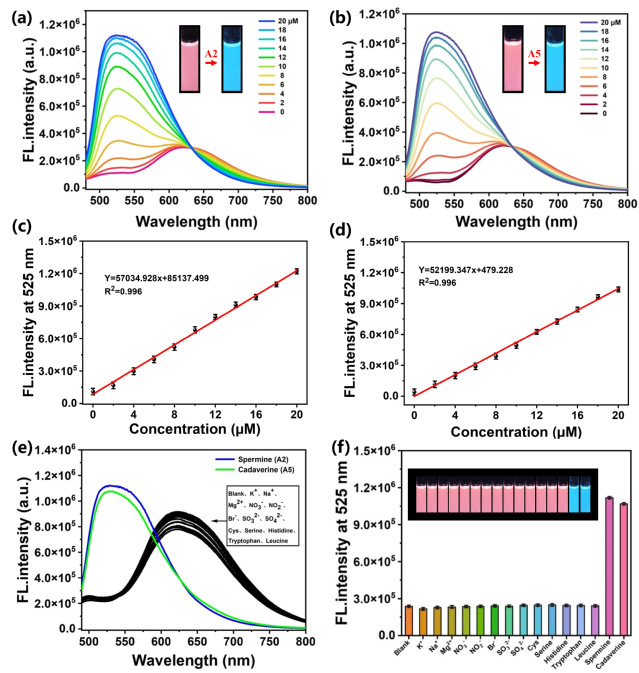 Figure 2. (a) Fluorescent emission of BTPC-Ta solution over different concentrations of spermine (A2); (b) Fluorescent emission of BTPC-Ta solution over different concentrations of cadaverine (A5); (c) LOD extracted from (a); (d) LOD extracted from (b). [BTPC-Ta] = [A1, A2, A3, A4, A5] = 50 μΜ; solvent: HPLC DMSO. (e) Fluorescence spectra of BTPC-Ta (10 μΜ) in the presence of spermine and cadaverine and various analytes: K+, Na+, Mg2+, NO3-, NO2-, Br-, SO32-, SO42-, cysteine (Cys), serine, histidine, tryptophan, leucine, spermine and cadaverine (10 μM). (f) Histogram of fluorescence (F525 nm) shown in (e); Inset: photographs of BTPC-Ta in the presence of spermine and cadaverine and various analytes were recorded under 365 nm.
