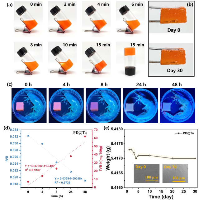 Figure 3. (a) Gelation process of PD@Ta; (b) Comparison of the morphology of PD@Ta after 30 days of storage at room temperature; (c) Fluorescence photos of the gel sensor PD@Ta monitoring the spoilage process of shrimp at 25℃; (d) The time-dependent curve of the R/B ratio for TVB-N and PD@Ta gel; (e) Mass changes of PD@Ta over 30 days, with inset images showing SEM cross sectional images of PD@Ta on day 0 and day 30.