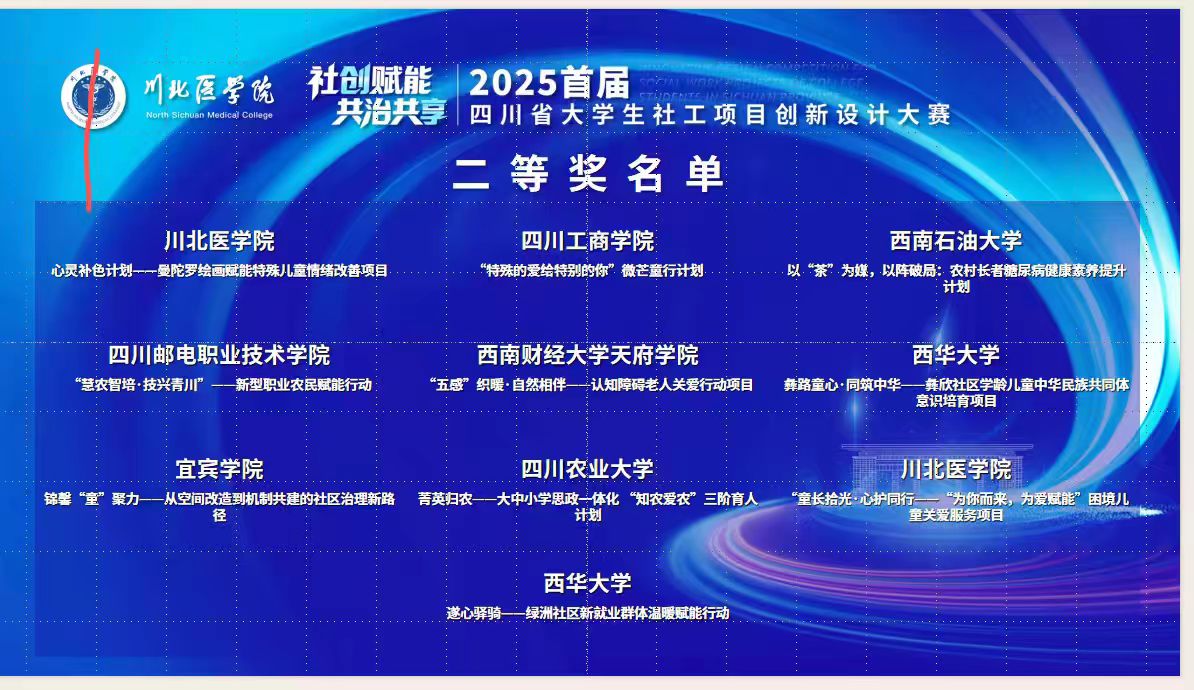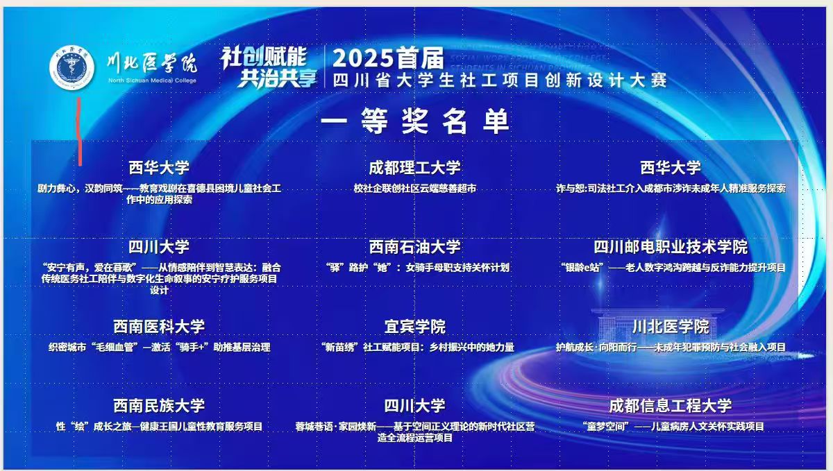11月10日,由四川省教育厅、中共四川省委社会工作部主办的四川省大学生社会工作创新项目大赛在川北医学院圆满收官。必威西汉姆联社会工作与健康管理学院(心理健康教育中心)四支队伍参与决赛角逐,最终斩获一等奖2项、二等奖2项,刘婷老师等获评“优秀指导教师”。