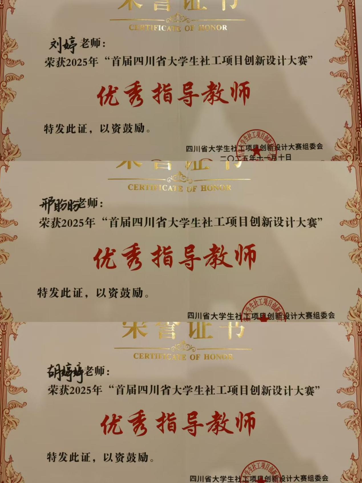 优秀指导教师荣誉证书(邢盼盼、胡婷婷为校外导师)