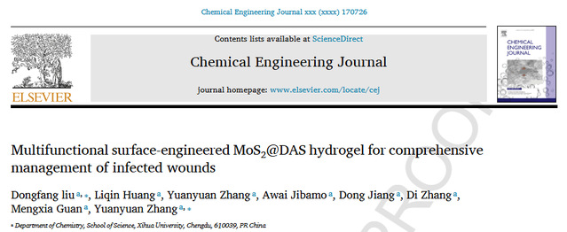 近日,理学院萜类天然产物研究团队在化学工程与工程技术领域Top期刊《Chemical Engineering Journal》(中科院一区Top,IF=13.2)发表题为“Multifunctional surface-engineered MoS2@DAS hydrogel for comprehensive management of infected wounds”的研究成果。理学院刘东芳博士为本文第一/通讯作者,2023级生物与医药专业硕士研究生黄莉秦为本文第二作者,张园园教授为本文共同通讯作者。