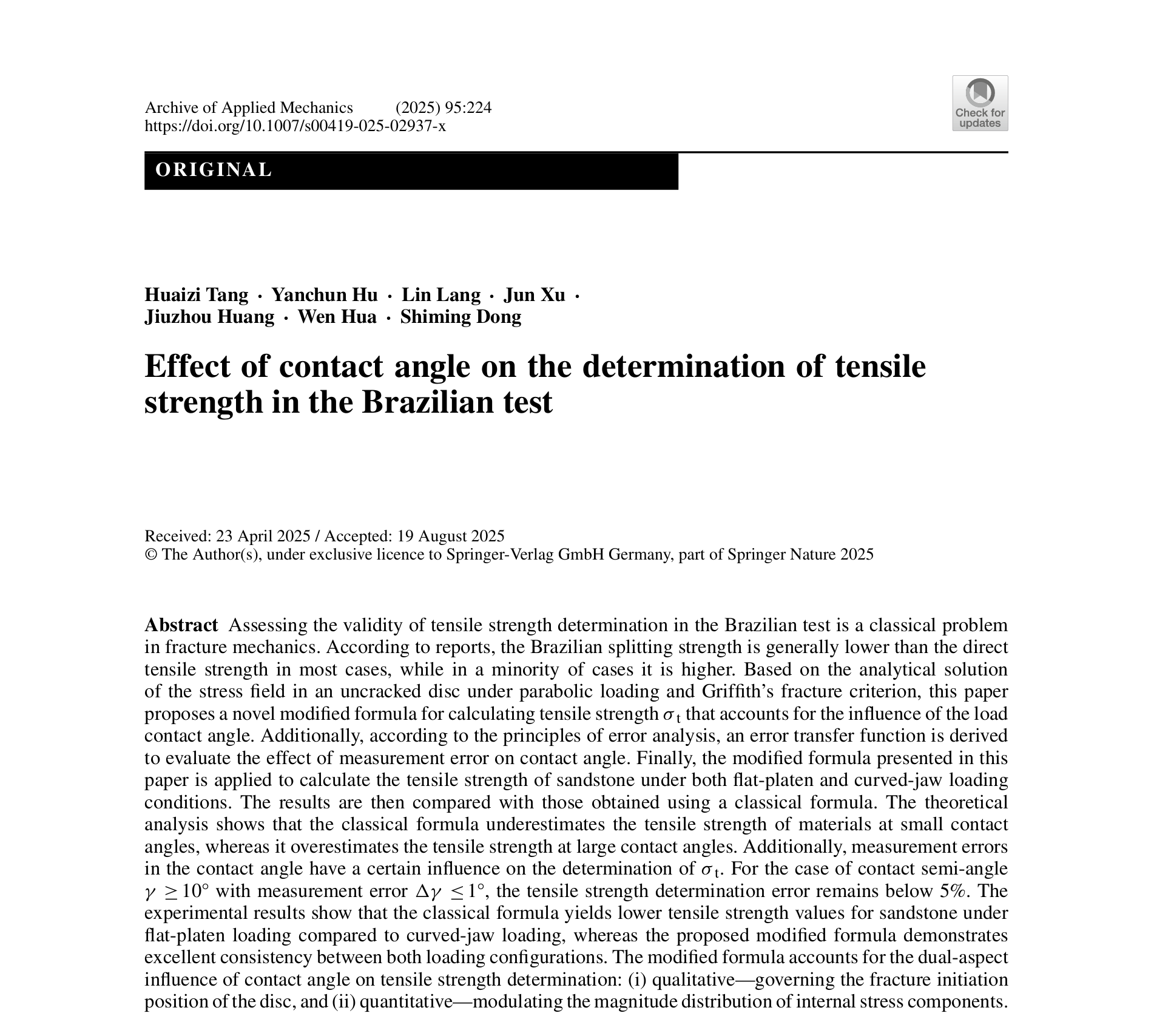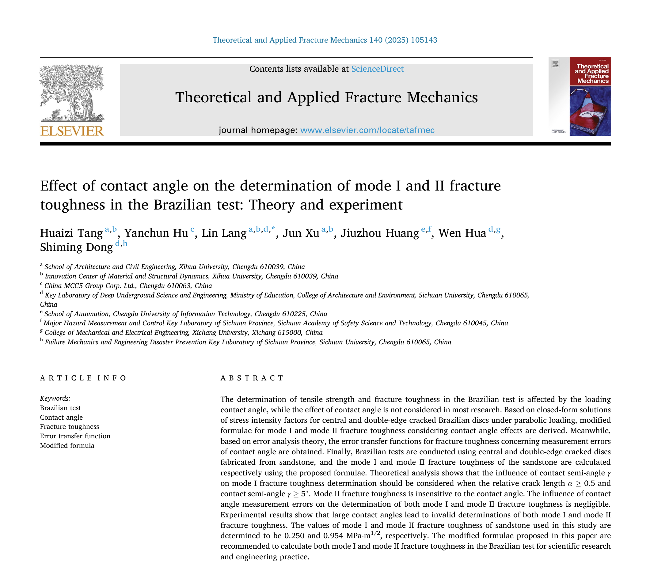 近日,建筑与土木工程学院材料与结构动力学创新研究团队在国际知名期刊《Theoretical and Applied Fracture Mechanics》(JCR一区、中科院二区TOP,IF=5.6)和《Archive of Applied Mechanics》(JCR二区、中科院三区,IF=2.5)分别发表题为“Effect of contact angle on the determination of mode I and II fracture toughness in the Brazilian test: Theory and experiment”和“Effect of contact angle on the determination of tensile strength in the Brazilian test”的系列研究成果。bw必威西汉姆联官方网站为论文第一单位,建筑与土木工程学院郎林副教授为通讯作者,团队汤淮子博士为第一作者、徐军博士为参与作者。