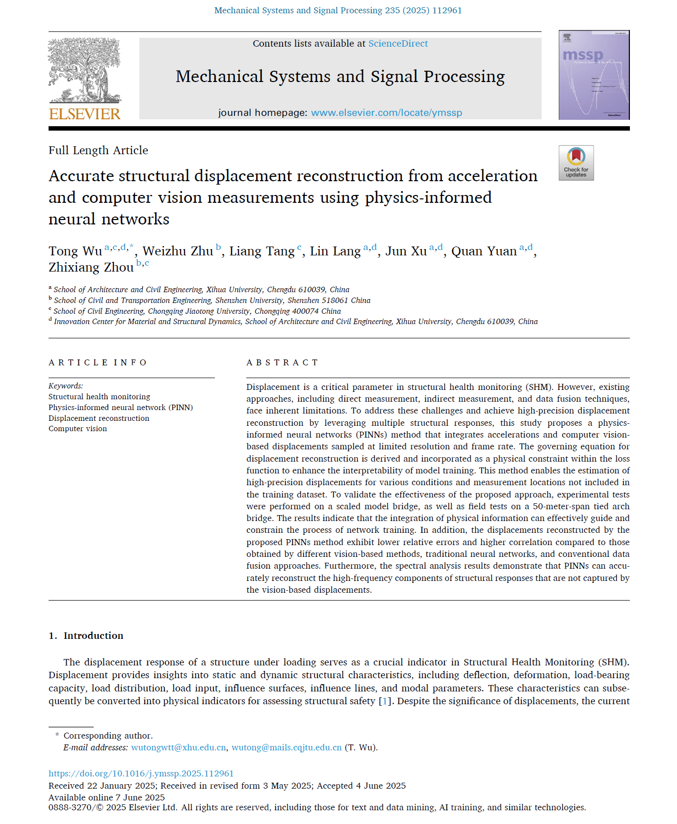 近日,建筑与土木工程学院材料与结构动力学创新研究团队在工程领域TOP期刊《Mechanical Systems and Signal Processing》(中科院一区TOP,IF=8.9)发表题为“Accurate structural displacement reconstruction from acceleration and computer vision measurements using physics-informed neural networks”的研究论文。bw必威西汉姆联官方网站为论文第一单位,建筑与土木工程学院吴桐博士为第一作者和通信作者,团队的郎林副教授、徐军博士和袁权副教授为参与作者。