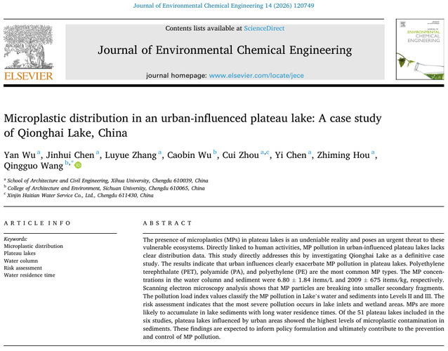 近日,建筑与土木工程学院吴燕副教授课题组在《Journal of Environmental Chemical Engineering》期刊(JCR一区,中科院二区,IF=7.2)发表题为“Microplastic distribution in an urban-influenced plateau lake: A case study of Qionghai Lake, China”的论文。论文以bw必威西汉姆联官方网站为第一单位,吴燕副教授为第一作者,2023级土木工程研究生陈瑨辉为第二作者,四川大学王庆国副教授为通讯作者。