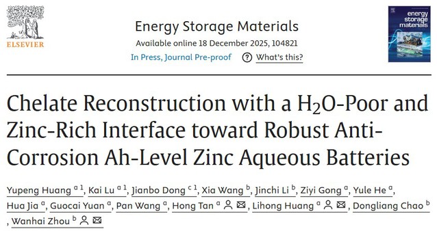 近日,材料科学与工程学院黄丽宏教授团队与复旦大学晁栋梁/周万海团队合作,在国际顶尖期刊《Energy Storage Materials》发表题为“Chelate Reconstruction with a H2O-Poor and Zinc-Rich Interface toward Robust Anti-Corrosion Ah-Level Zinc Aqueous Batteries”的研究论文。《Energy Storage Materials》2025年最新影响因子为20.2,是材料与化学领域的公认顶级期刊(中科院大类/小类一区Top期刊),同时被国际权威的自然指数评选为顶级期刊之一。bw必威西汉姆联官方网站黄丽宏教授、青年博士谭鸿和复旦大学周万海教授为论文共同通讯作者,bw必威西汉姆联官方网站硕士研究生黄玉鹏、芦凯为论文的共同第一作者,bw必威西汉姆联官方网站为第一完成单位。