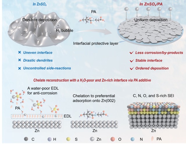 水系锌金属电池因其安全性高、成本低和环境友好等优势,被认为是新一代大规模储能的潜在备选技术。然而,锌金属负极在充放电过程中易发生枝晶生长及水诱导腐蚀副反应,严重影响了电池的循环寿命、倍率性能及实际应用前景。为此,本论文提出了一种基于泛酸(PA)的螯合重构策略。PA 分子可通过羧基和酰胺基与 Zn2+形成稳定螯合结构,重构内亥姆霍兹层(IHP),构建出一种“富锌、贫水”的电双层界面结构(EDL),该界面结构能够有效削弱水分子参与的腐蚀反应,从而显著提升锌负极界面稳定性。