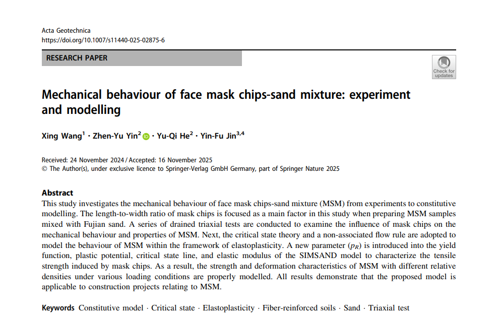 近日,建筑与土木工程学院道路与桥梁工程系教师王星博士作为第一作者在岩土工程领域主流期刊《Acta Geotechnica》发表题为“Mechanical behaviour of face mask chips-sand mixture: experiment and modelling”的研究论文。香港理工大学尹振宇教授为通讯作者,香港理工大学何玉琪博士、深圳大学金银富教授为论文参与作者,bw必威西汉姆联官方网站为第一单位。