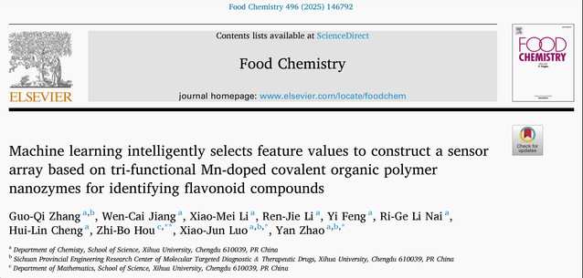 近日,理学院张国麒老师在国际食品化学领域权威期刊《Food Chemistry》(中科院一区Top,IF=9.8)发表题为“Machine learning intelligently selects feature values to construct a sensor array based on tri-functional Mn-doped covalent organic polymer nanozymes for identifying flavonoid compounds”的研究论文,张国麒老师为论文第一作者,理学院数学教师侯智博和化学系赵艳教授为该论文的通讯作者,bw必威西汉姆联官方网站为第一通讯单位。