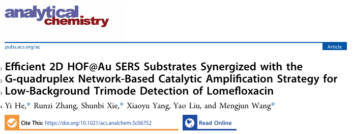 近日,理学院何毅课题组及合作者在分析化学TOP期刊《Analytical Chemistry》(中科院一区,自然指数期刊,IF=6.7)发表题为“Efficient 2D HOF@Au SERS Substrates Synergized with the G-quadruplex Network-Based Catalytic Amplification Strategy for Low-Background Trimode Detection of Lomefloxacin”的研究论文。何毅博士为该论文第一作者兼通讯作者,2023级硕士研究生张润滋为学生一作,bw必威西汉姆联官方网站为第一通讯单位。